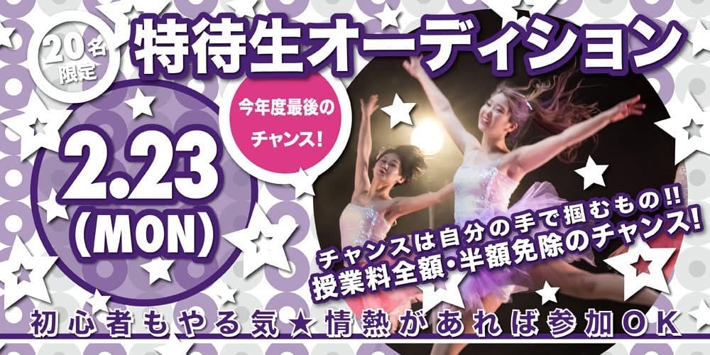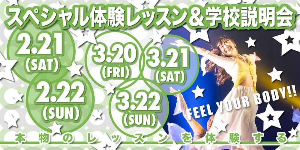 日程:2026年2月21日(土)/2月22日(日)/3月20日(祝金)/3月21日(土)/3月22日(日) レッスン内容: 東京ステップスアーツレギュラー講師による、プロになるためのレッスンを用意! ダンスや歌は好きだけどプロになるにはどうしたらいいんだろう…そんな悩みを一気に解消!「体験レッスン&学校説明会」に参加してみよう!!レッスン詳細はオフィシャルサイトをチェック!!